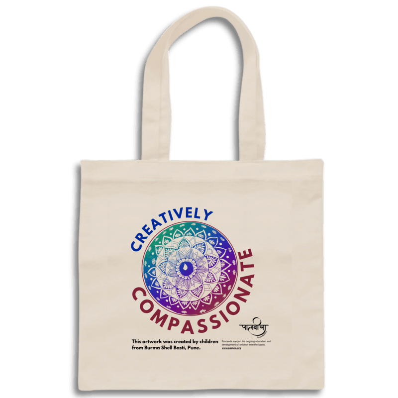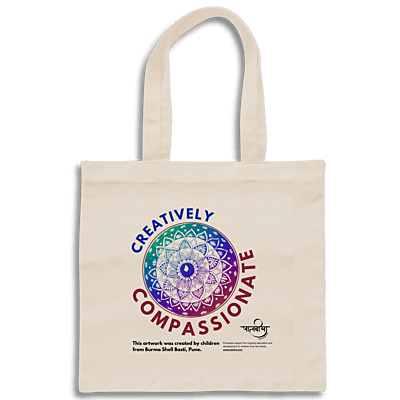 The tote bag features the original artwork created by children from Burma Shell Basti in Pune. Proceeds from this is reinvested in education and training of the children.